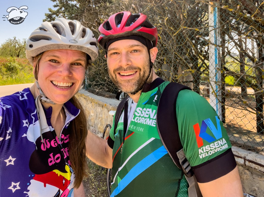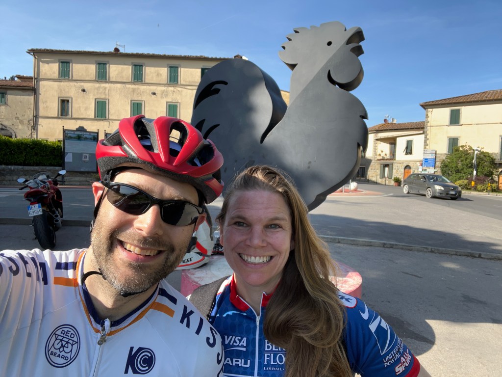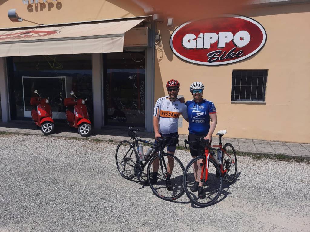 We both slept hard until about three in the morning when we were suddenly wide awake. Sleep eluded us until about five in the morning when we finally passed out again. Unfortunately, when our alarm tried to entice use out of the bed, we had a hard time pulling ourselves from the sheets. As much as we wanted to stay in bed, we had to get going. Pasquale, my sister’s friend, was going to meet us at the house and bring the two of us, and my bike, to the bike shop Gippo Bikes, where I had reserved a bike rental for Amy. As it is, we were running quite late, but after a rushed breakfast, we managed to arrive at the shop sometime after elven in the morning. The shop was very accommodating, and after a quick setup, Amy and I were ready for our first ride together in Tuscany.