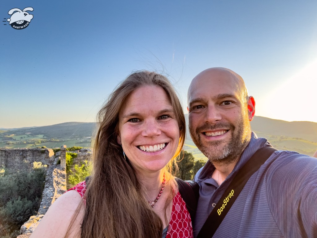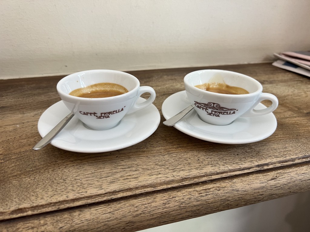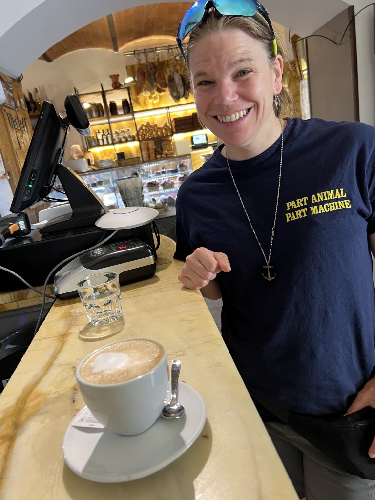 With Amy’s bike returned, and my bike placed back into storage, my sister and her partner invited us to go for a hike. We got out early and parked one of the cars over at Monteriggioni. We had a morning coffee, and Amy got her first real cappuccino.