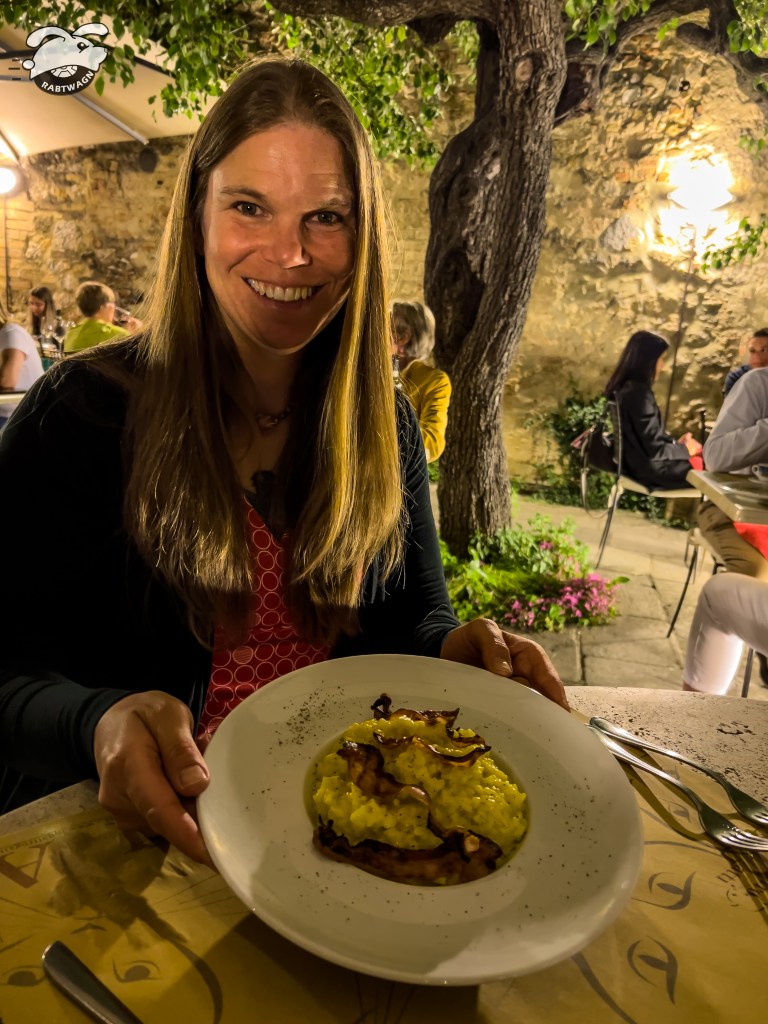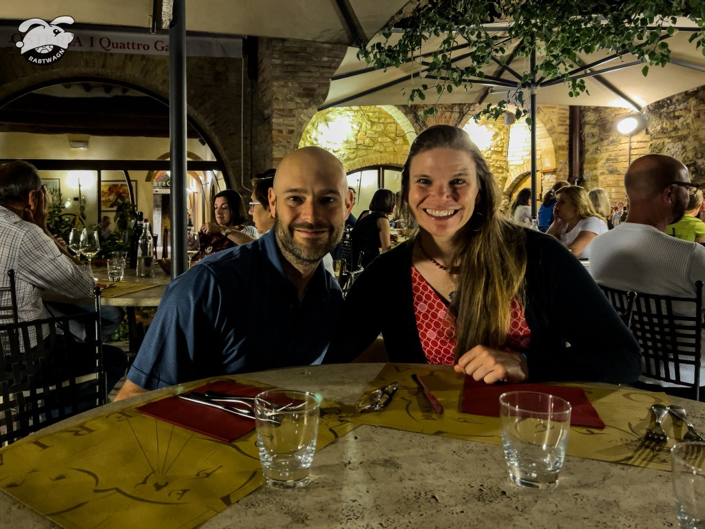 From their website: “Located in a historic building in the center of San Gimignano, the Osteria I Quattro Gatti was born from a skilful renovation of ancient spaces full of history. In the center of the room it is still possible to see an old granary used in the Middle Ages.” Andrew ordered the traditional Tuscan Pici and I wanted to try Risotto with leek and bacon. We followed this amazing dinner with dessert and coffee.
