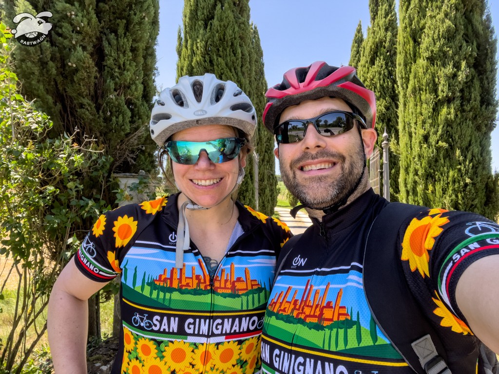 We ate a picnic lunch of sandwiches and bananas we had brought with us while sitting in the center of town by the church. We had scheduled a return that evening on foot to walk around and eat dinner with Elizabetta (and her partner) so we were not pressured to see everything at once. We did find some matching San Gimignano bike jerseys that were on sale and we are quite pleased with them. We rode back down the hill to Poggibonsi.
