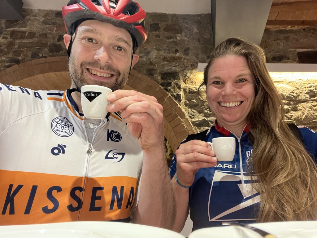 Just outside of San Leonino is where most of the climbing kicks in. We had six and a half uphill miles before we would summit in Castellina. Suffice to say, Amy ended up suffering a bit on this section. However I am proud of her because she dug deep and managed to get herself to the top where we gulped down yet another coffee. The reward for all that climbing was going to be the long eighteen kilometer descent where one almost does not have to pedal at all.