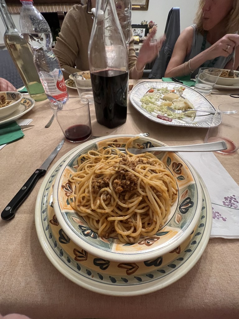 The special part of the meal besides getting to meet everyone was the dish that was served. Cinghiale! Cinghiale is wild boar and they are all over Tuscany! We even saw a group of them roaming the side of the road the night we drove back from San Gimignano so I know it’s not a myth. The cinghiale are hunted between November and January, and the boar meat is so popular that one dish – Pappardelle Cinghiale, is known as Tuscany’s national dish. They are a local delicacy and a local emblem. We saw loads of T-shirts honoring this animal at souvenir shops. They are even more popular than bicycles! Cats are maybe the most popular thing for souvenirs and T-shirts too. Everything has cats on it!