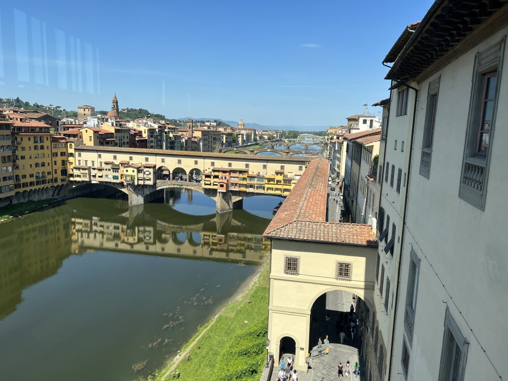 With our feet tired from walking the length of the galleries we scooped up our cameras and proceeded to our next destination. Elizabetta’s work office. We walked along the Arno River and across the Ponte Vecchio which was completed in 1345. One thing I noticed was the lack of boats on the river. It was bare of human activity. Being from NYC this was a new sight for me as our rivers can have pretty congested traffic with ferries, speedboats, kayaks, jet skis and sail boats. In Florence, the river was quiet. There was a group of rowers from a local rowing club but nothing with motors. You could see in some places, it was quite shallow. I think there are some rapids or something outside the city which make it un-navigable. Regardless, it was beautiful.