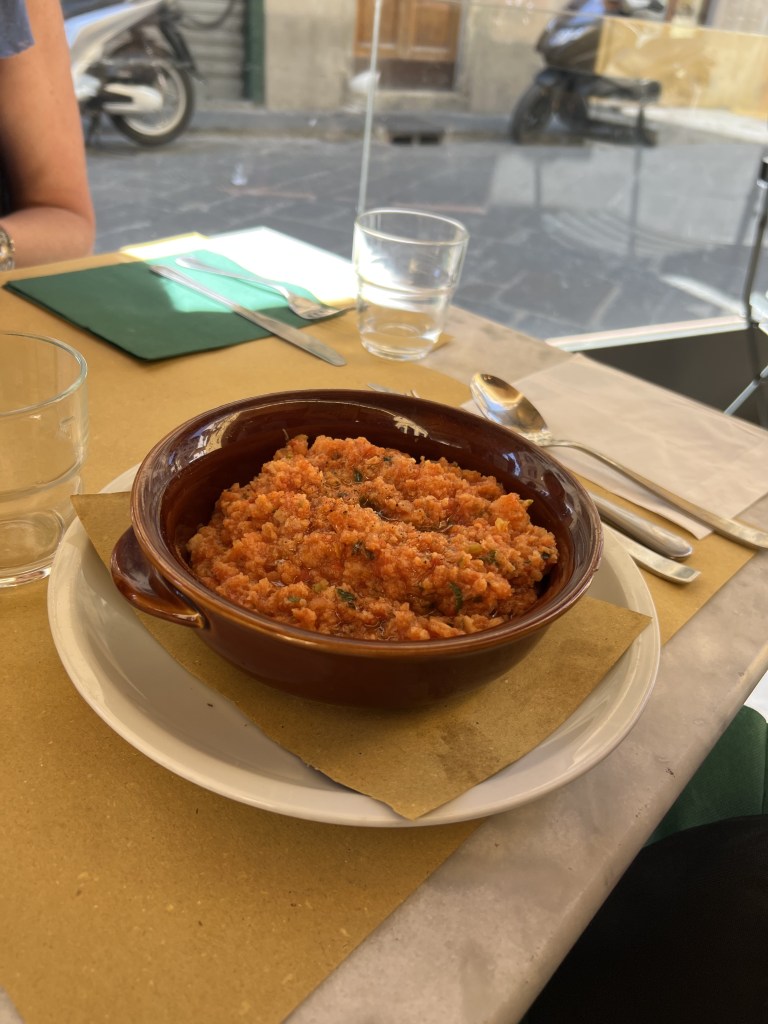 We crossed the bridge which was lined with expensive jewelry makers (lots of fancy gold and diamonds). Ponte Vecchio is the oldest bridge today because the other bridges (6 of them) got bombed out during WW2 by the Nazis. Ponte Vecchio was the only one to remain. So we walked across this historic old bridge lined with billions of euros worth of gold jewelry (NBD) and sauntered down the Arno to where Elizabeth works (what a place to work!). She specializes in foreign exchange students and is currently working at a school which partners with universities all over the world to host students for a semester in Florence. They help with accommodations and Elizabetta has the fancy title of Resident Director. She works really hard to make sure the American students are comfortable. Not an easy task! We met her office co-workers and their super cute shaggy dog named Giotto and after hearing a few complaints about students, we were on our way to lunch at an outdoor cafe. At Elizabeth’s suggestion, I ordered a traditional Tuscan meal of Pappa al Pomodoro. It was a tomato soup using leftover bread. Quite delicious! I also ordered a side of spinach because I needed some green food! There is lots of scrumptious bread and cheese in Italy and it was an effort to add a salad or two because we were too busy drinking espresso and eating gelato!
