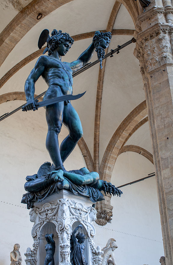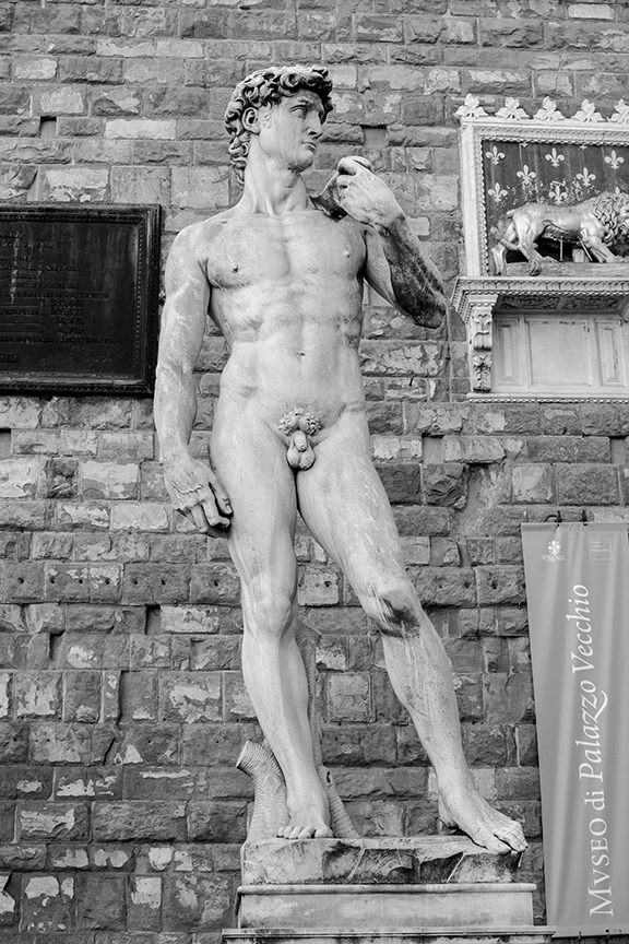 It was a long debate and nine different sites were considered. Eventually the statue was placed in the Piazza della Signoria (the political center of Florence). “It was midnight, May 14th, and the Giant was taken out of the workshop. They even had to tear down the archway, so huge he was. Forty men were pushing the large wooden cart where David stood protected by ropes, sliding it through town on trunks. The Giant eventually got to Signoria Square on June 8th 1504, where it was installed next to the entrance to the Palazzo Vecchio, replacing Donatello’s bronze sculpture of Judith and Holofernes” wrote Luca Landucci, a herbalist living nearby who chronicled the events. I bet they are glad they didn’t drop him in transport!